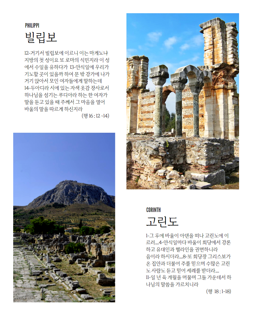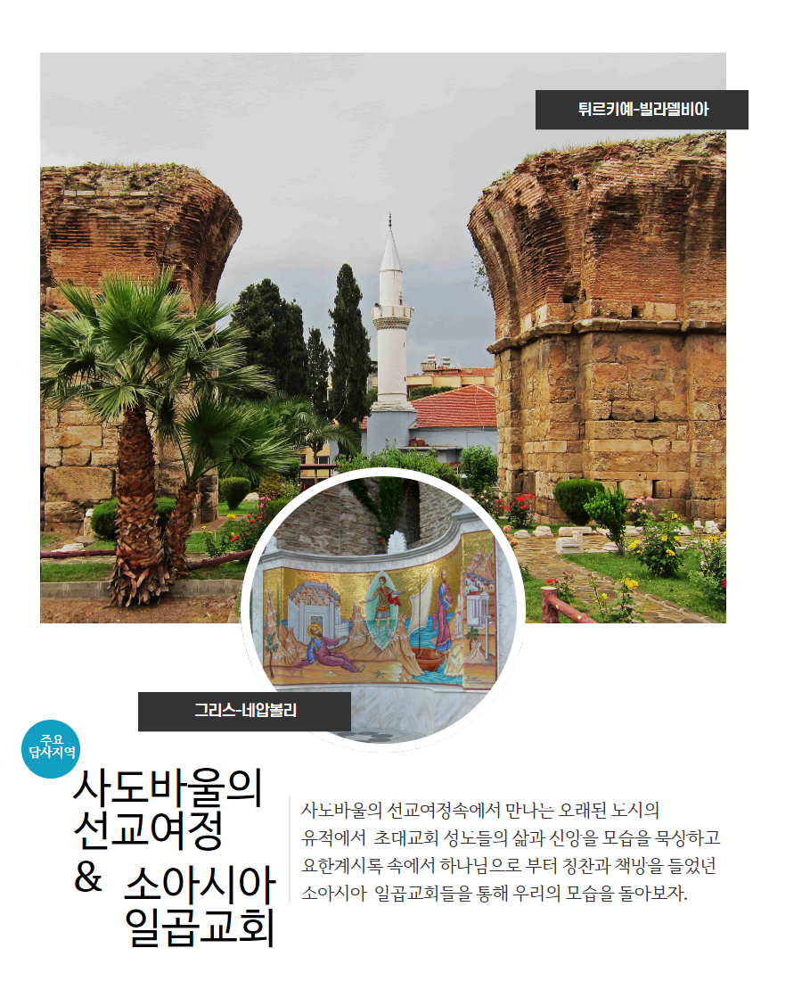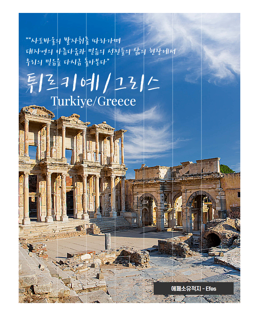 ☑️ 사도바울의 발자취를 따라 핵심적인 기본일정으로 가성비 최고의 여행일정 ☑️ 사도바울의 선교여정과 초대교인의 신앙과 삶의 현장탐방 ⛪ 카파도키아 : 괴뢰메-동굴교회, 데린구유-지하도시 ⛪ 사도바울의 선교여정 : 이고니온,비시디아안디옥,네압볼리,빌립보, 데살로니가,고린도, 아테네 ⛪ 소아시아일곱교회 : 라오디게아, 빌라델비아, 사데, 에베소 ⛪ 사도요한기념교회, 누가의묘 ☑️ 경이롭고 아름다운 자연경관과 동서양이 만난 역사문화의 현장탐방 📌 이스탄불 : 성소피아성당, 돌마바체궁전 📌 카파도키아 : 파샤바계곡, 우치히사르, 괴뢰메야외박물관 📌 데니즐리 : 파묵칼레-노천자연온천 📌 에페소 : 고대로마시대 유적지 📌 까람바카 : 메테오라-공중수도원 📌 아테네 : 아크로폴리스-고대그리스 유적지 📌 델피 : 고대 아테네 역사문화 유적지